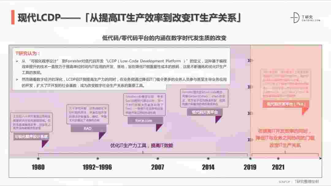 2020年前后,,,,,,,,源于提高IT工作者开发效能的LCDP不断进化和衍生,,,,,面对业务导向日益明显的数字化变革。。。。。。。。。。。LCDP衍生出了面向不同对象的升级服务——面向专业人群的LCDP和业务人群的NCDP,,,,,,,LCDP与NCDP的不同服务属性被逐渐认可和接受。。。。。。。。。。 LCDP在提高IT开发效率的同时,,,,,降低IT与业务之间协同的门槛改变IT生产关系。。。。。。。